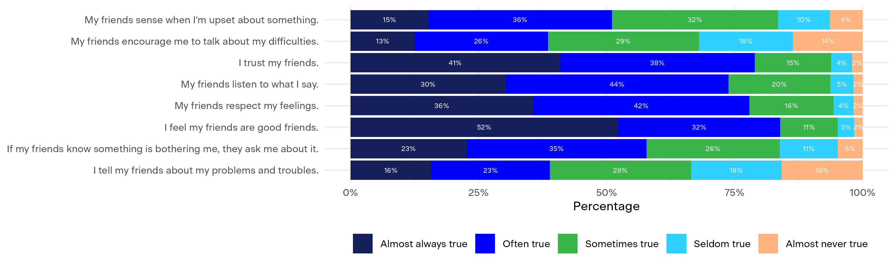 Most young people reported having positive peer relationships, characterised by strong peer trust and respect — 84% feel that they have good friends. 39% reported of young people said that their friends often and almost always encourage them to talk about their difficulties.